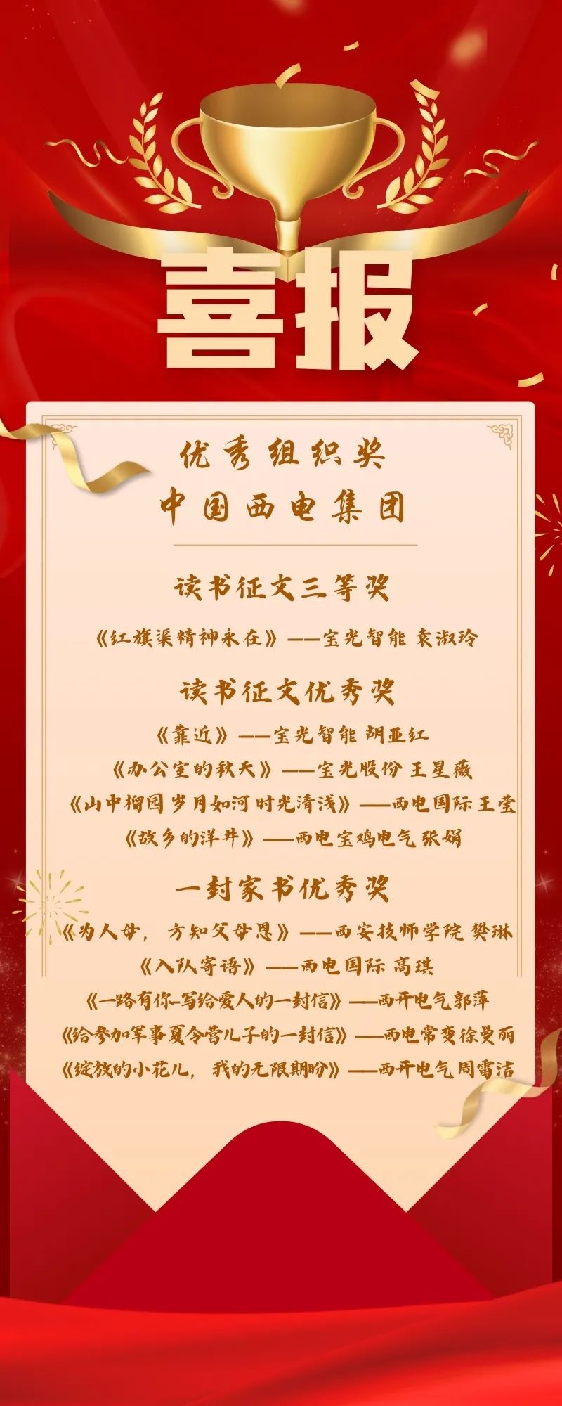 近日,以“阅读新时代·铸就新辉煌”为主题的第十一届“书香三八”读书活动获奖作品揭晓,中国西电集团工会荣获优秀组织奖,10个作品受到组委会表彰,这是西电集团连续八年参加全国“书香三八”读书活动并获奖。