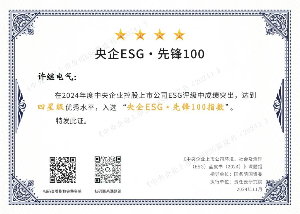 11月7日,由国务院国资委社会责任局主办,责任云研究院承办的“第七届中国企业论坛之国有企业社会责任平行论坛”在北京顺利召开,全面总结国有企业社会责任发展经验和阶段性特征。会上发布了《中央企业上市公司环境、社会及治理(ESG)蓝皮书(2024)》及“央企ESG·先锋100指数(2024)”等重要指数榜单。许继电气连续两年入选“央企ESG·先锋100指数”。